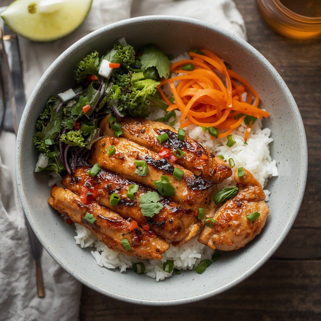 - 7. Assemble the Bowls: Divide rice evenly among bowls, then grilled chicken over the rice.