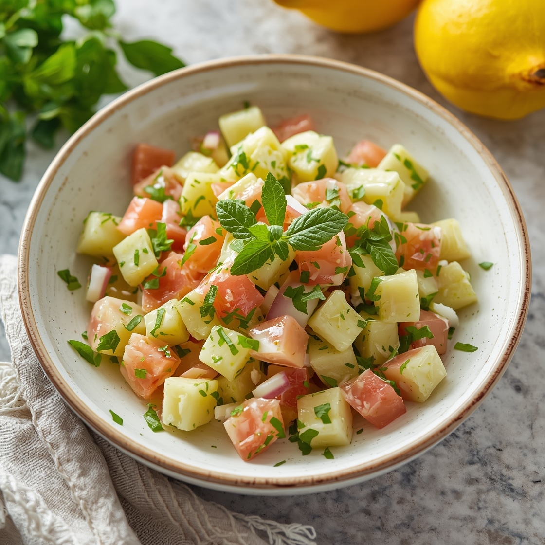 A refreshing lemon salad made with mixed greens, cherry tomatoes, cucumber, red onion, and crumbled feta cheese, tossed in a bright lemon vinaigrette. Perfect as a light lunch or side dish.