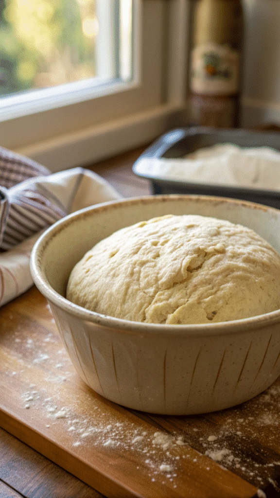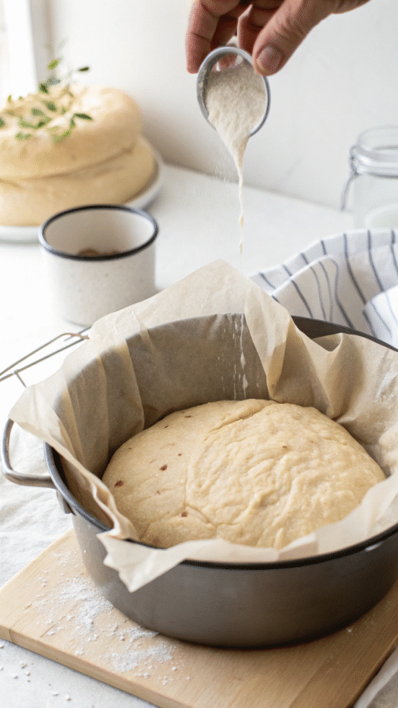 The process is gentle and straightforward. Mix the dry ingredients, add warm water, stir until combined, and let the dough rise. After the rest, transfer the dough to a baking dish or Dutch oven and bake until golden and crisp on the outside.