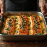 Sheet pan salmon casserole: a symphony of flavors and textures baked to golden perfection on a single sheet pan. This isn’t just a meal; it’s a memory in the making, inspired by my grandmother’s knack for transforming simple ingredients into extraordinary dishes. Growing up, comfort food was her love language, and this sheet pan salmon casserole is my modern interpretation, blending her classic casserole charm with the ease of sheet pan cooking.
